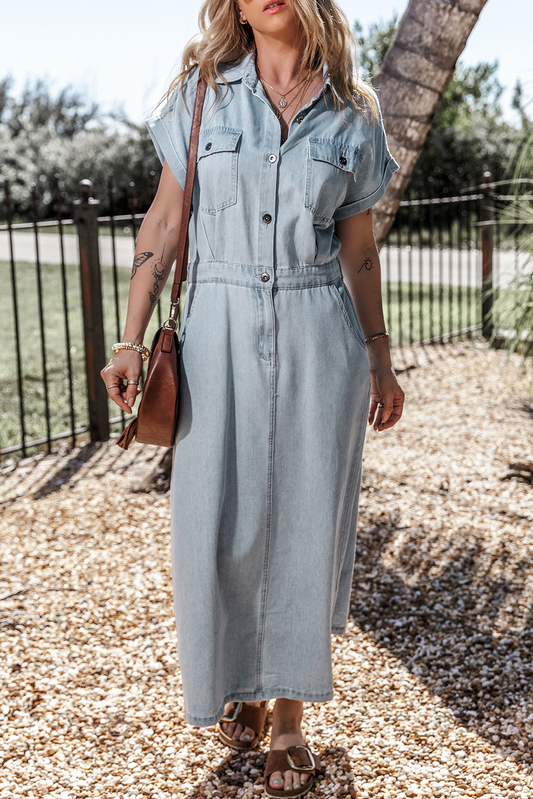 Beau Blue Mineral Wash Ruffled Short Sleeve Buttoned Denim Dress
