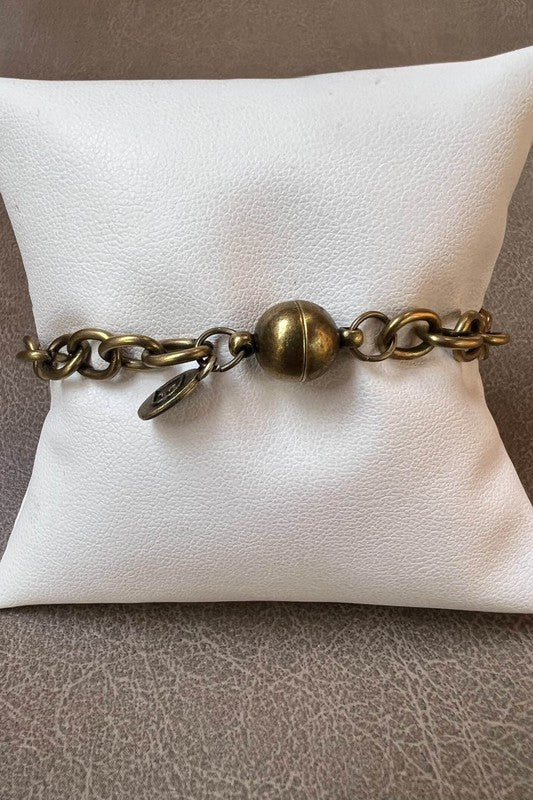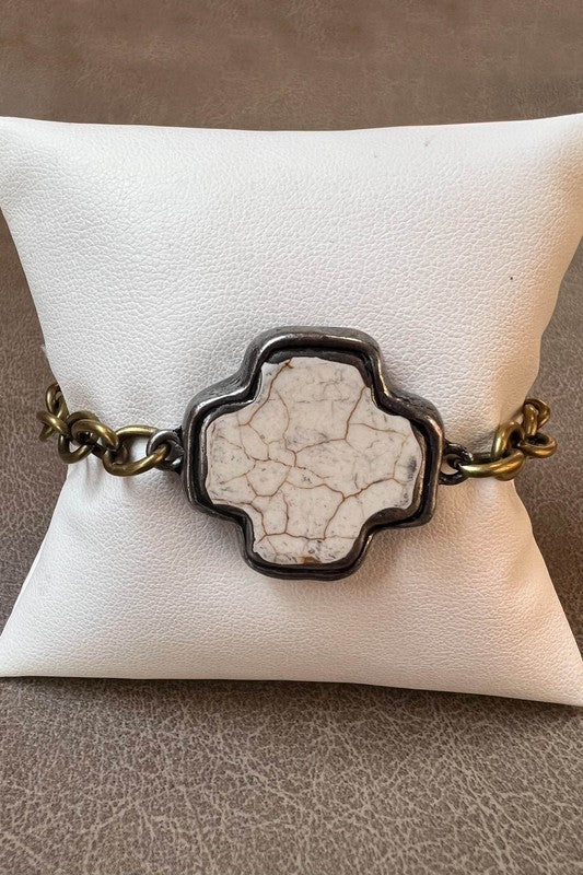 Elevate your style with the Danica Bracelet White. Crafted with a bronze chain link and magnetic closure, this bracelet features a soldered stone cross pendant for a unique touch. This bracelet comfortably fits smaller wrists. Embrace the natural variations in color and texture for a one-of-a-kind accessory. Diameter: 2.5". Approx. 6.5" in length.
