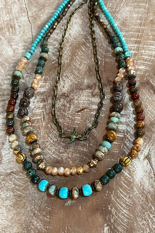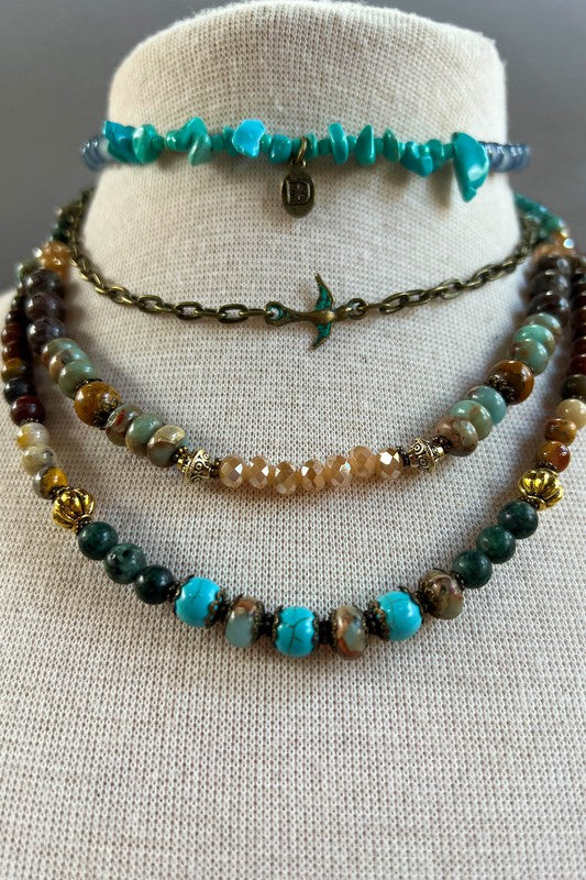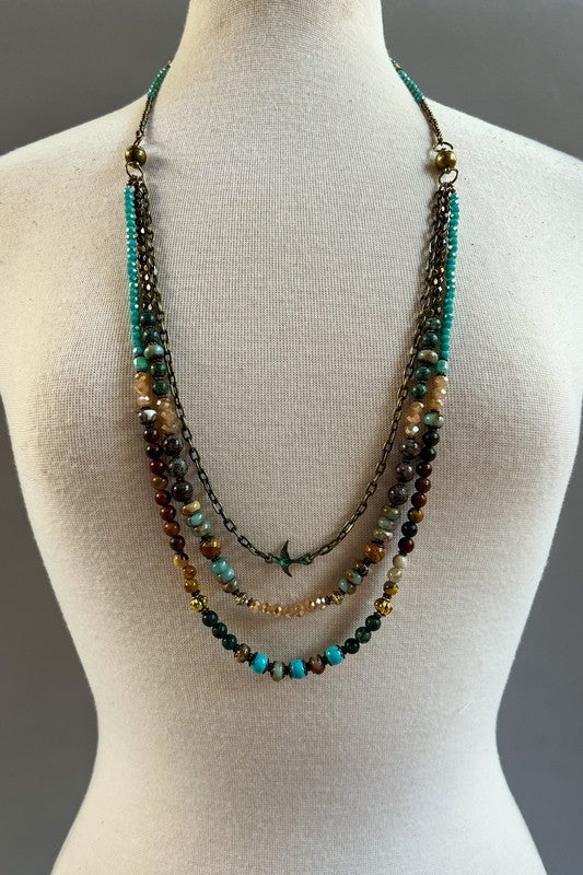 Unleash your creativity with the Tori Necklace! This versatile piece can be styled in 5 different ways thanks to its magnetic closure. Transform it into a long necklace, bracelet, or choker - the possibilities are endless. With 3 layers of neutral beading, this necklace adds a touch of elegance to any outfit. (Stones may vary.)